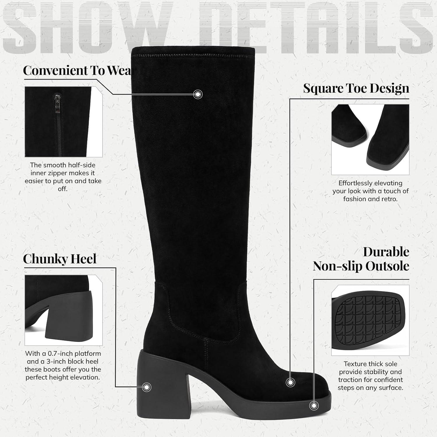 Tscoyuki Women’s Knee High Boots, Square Toe Platform Boots – Half Zipper Chunky Heel Tall Boots for Women