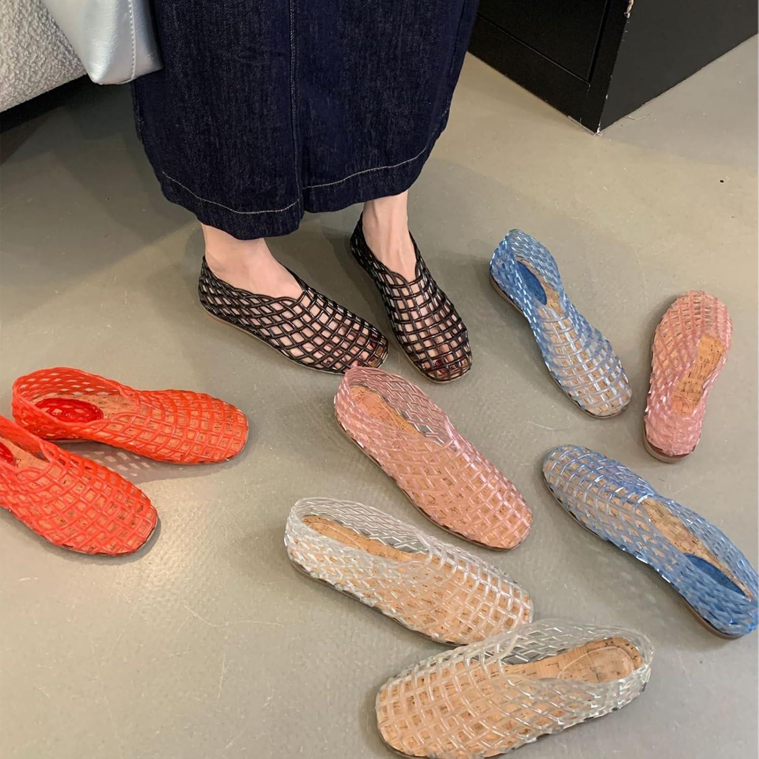 Tscoyuki Jelly Mesh Ballet Flats for Women Clear Fishnet Ballerina Flats Slip On Mary Jane Flats Hollow Causal Daily Flat Shoes(Black)