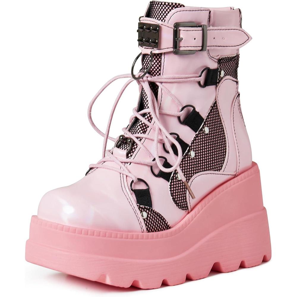 Tscoyuki Platform Ankle Boots for Women Chunky High Heel Booties Goth Round Toe Combat Boots Women Lace Up Motorcycle Wedges(1-pink)