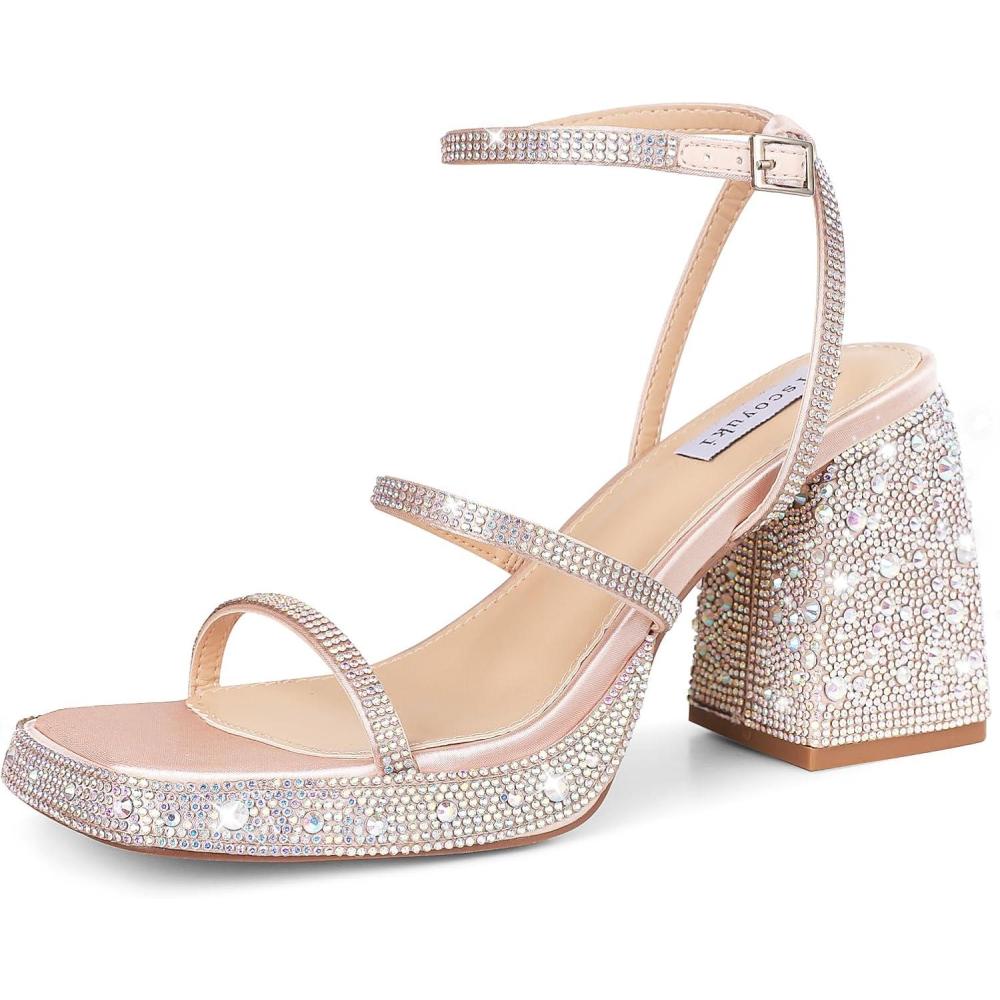 Tscoyuki Platform Heels for Women Sparkly Rhinestone Strappy Heels Sandals Chunky Heel Ankle Strap Square Open Toe Y2K Dress Shoes for Wedding Party Evening Dance(Nude Rhinestones)