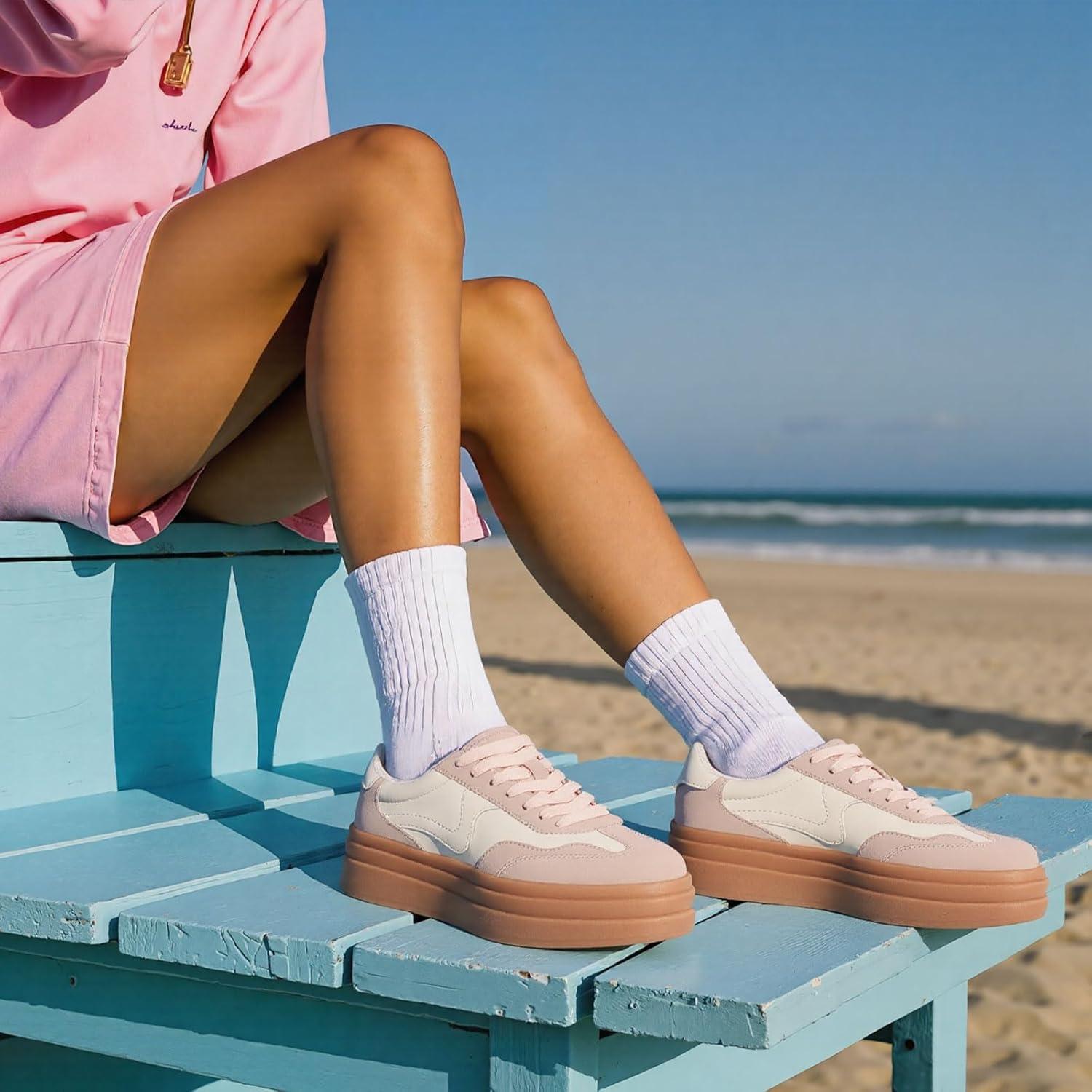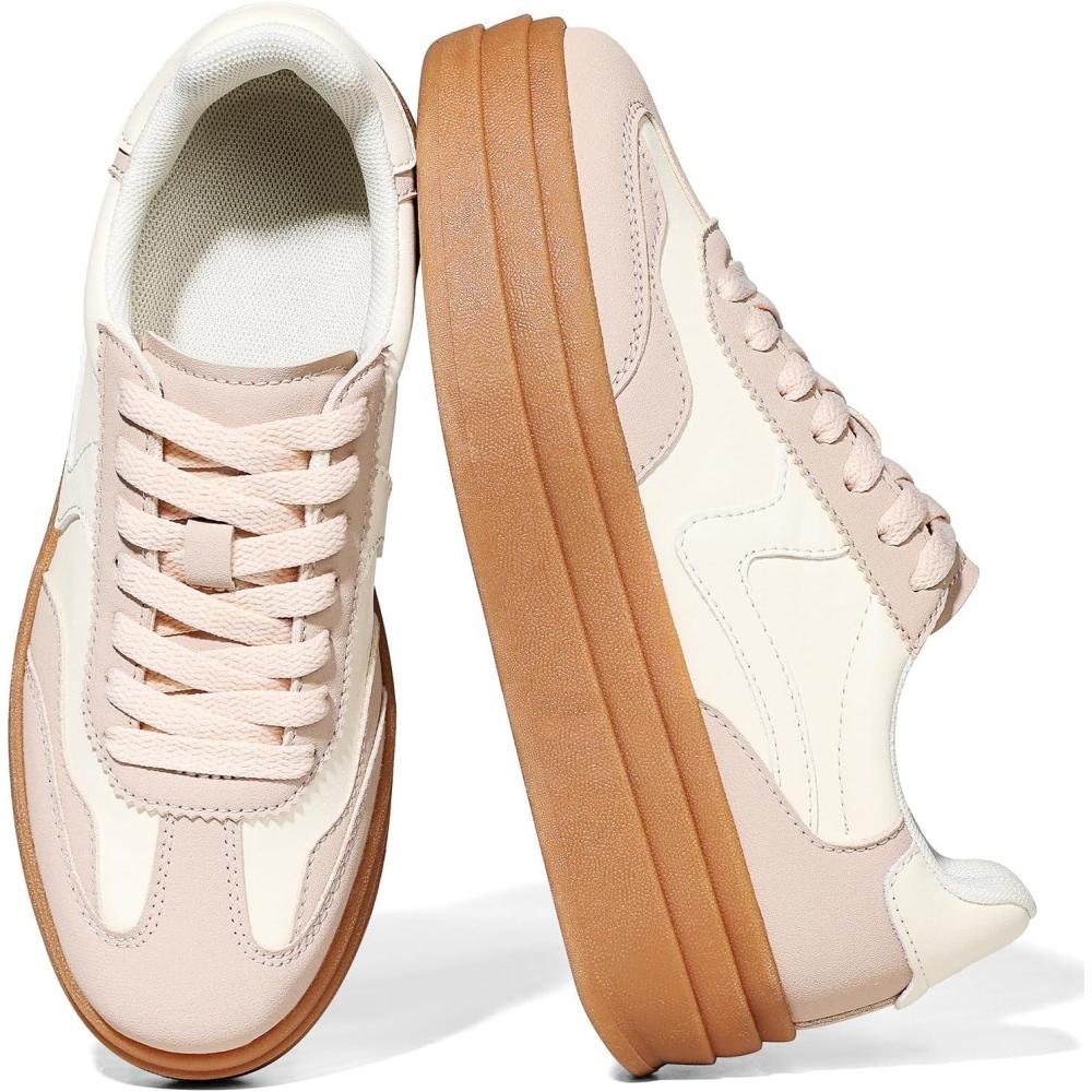 Tscoyuki Platform Women’s Fashion Sneakers Casual Spring Shoes Non Slip Lightweight Walking Shoes Lace-Up Thick Sole Chunky Tennis Shoe(Nude Pink)