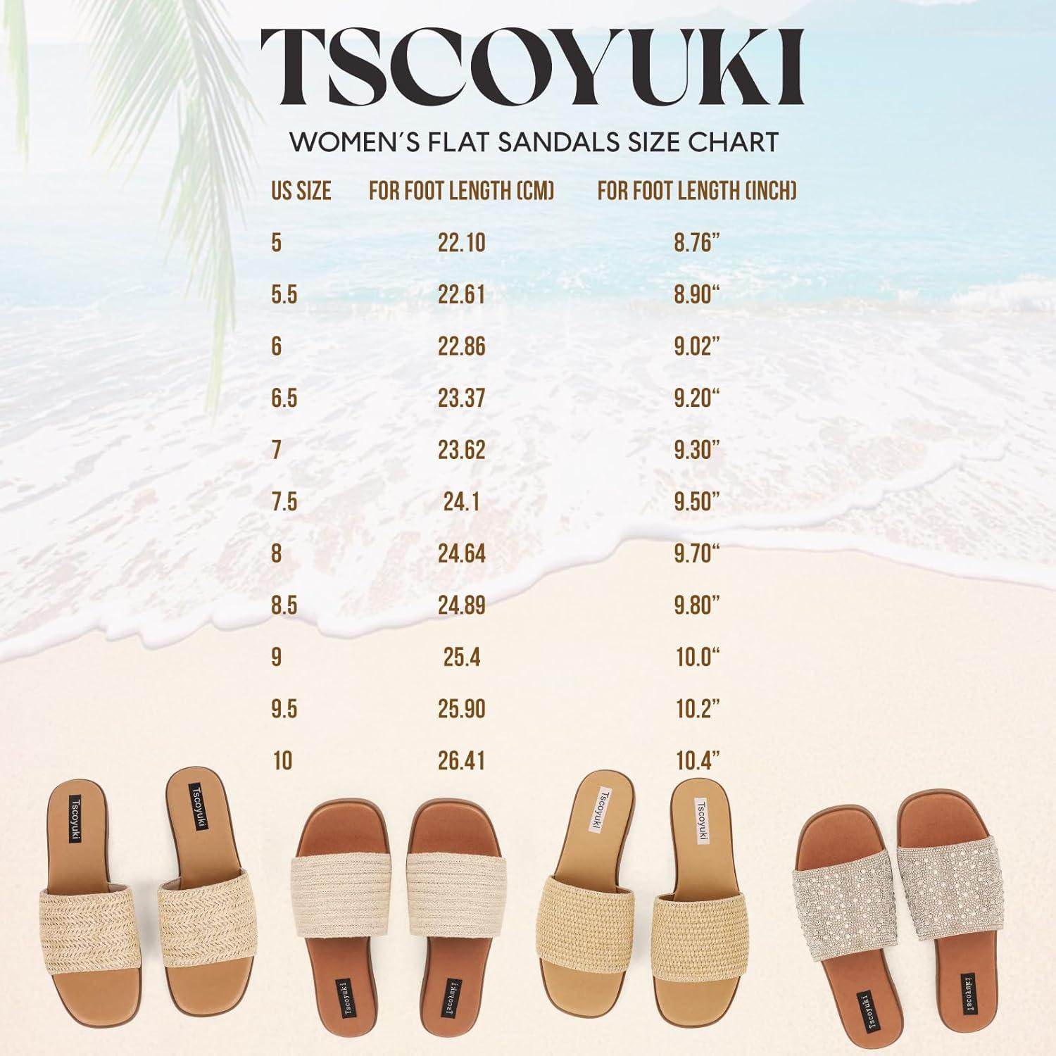 Tscoyuki Slides Sandals for Women Basic Slip On Flat Sandals Open Toe Comfort Beach Sandals Slippers for Casual Dressy Summer(Tan Raffia)