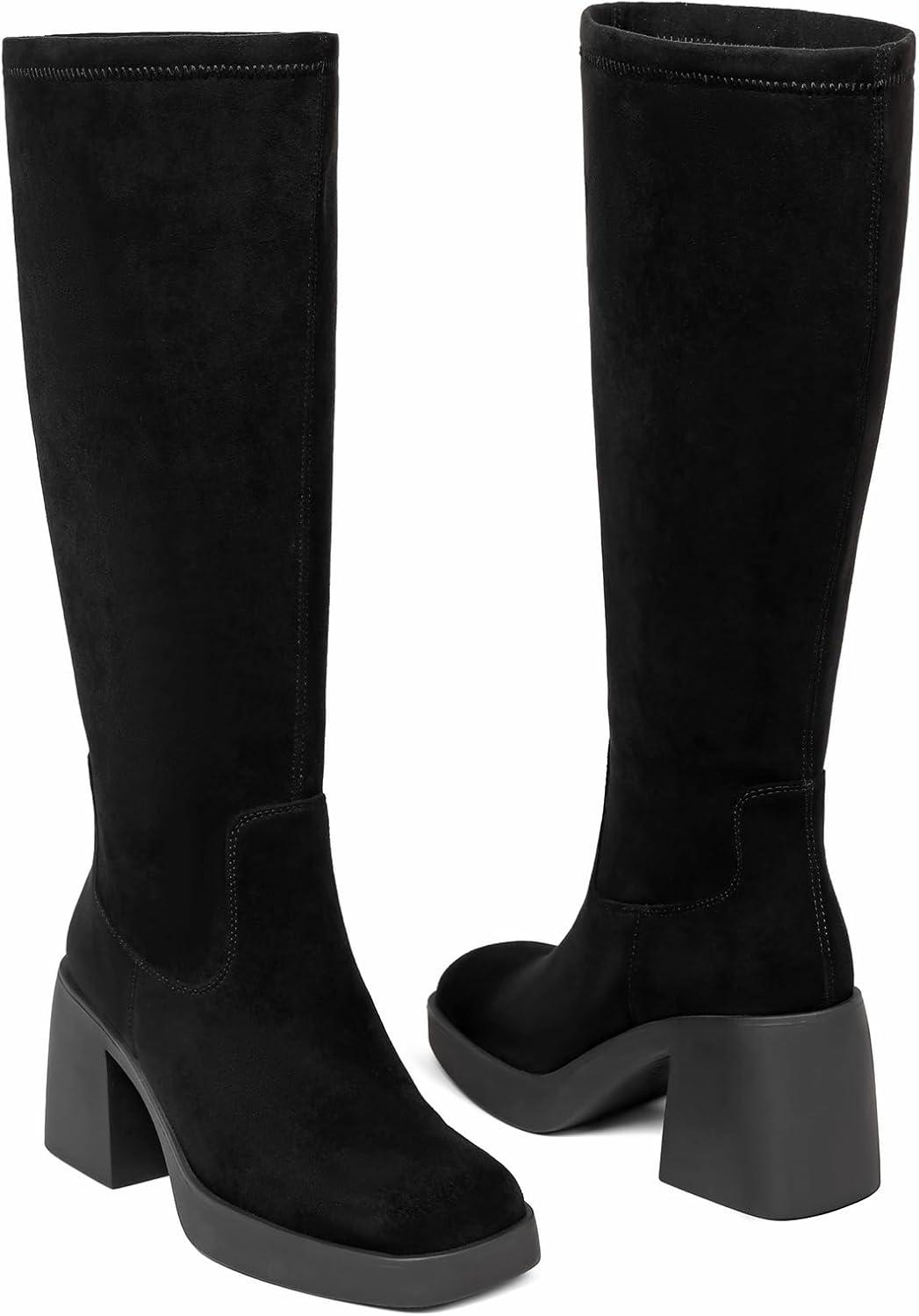 Tscoyuki Women Knee High Boots Square Toe and Chunky Block Heel Suede Boots with Half Side Zipper(Black Suede)