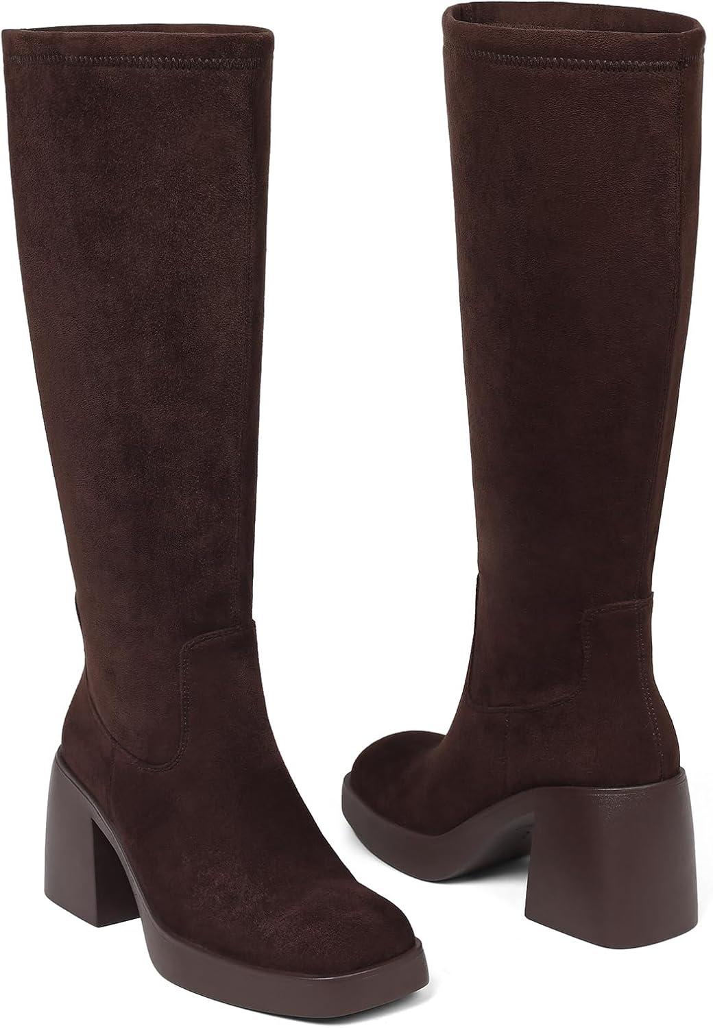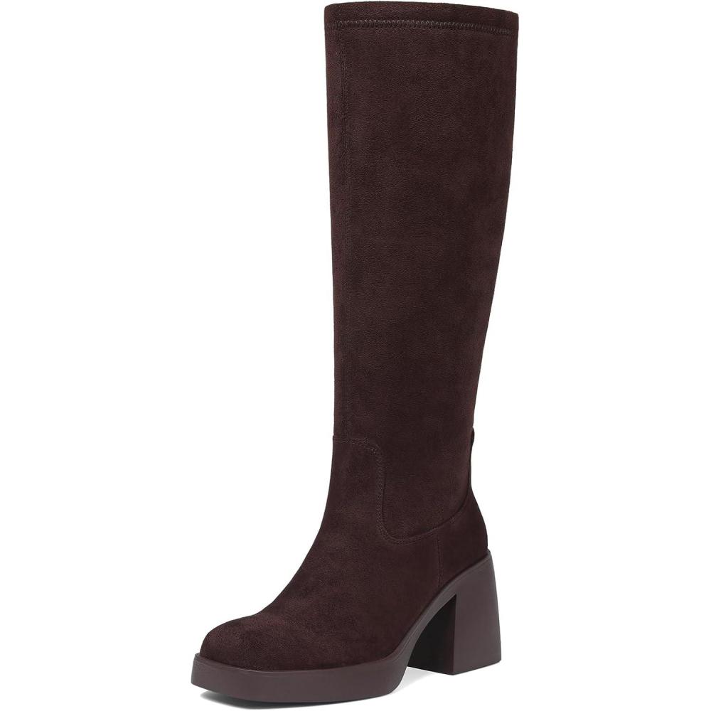 Tscoyuki Women Knee High Boots Square Toe and Chunky Block Heel Suede Boots with Half Side Zipper(Chocolate Suede)