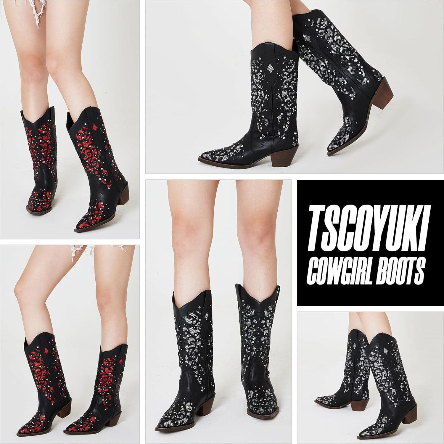 Tscoyuki Women’s Rhinestones Western Knee High Boots, Embroidery Pointed Toe Chunky Block Heel Cowboy Cowgirl Mid Calf Boots with Pull On Taps(Black# Red)