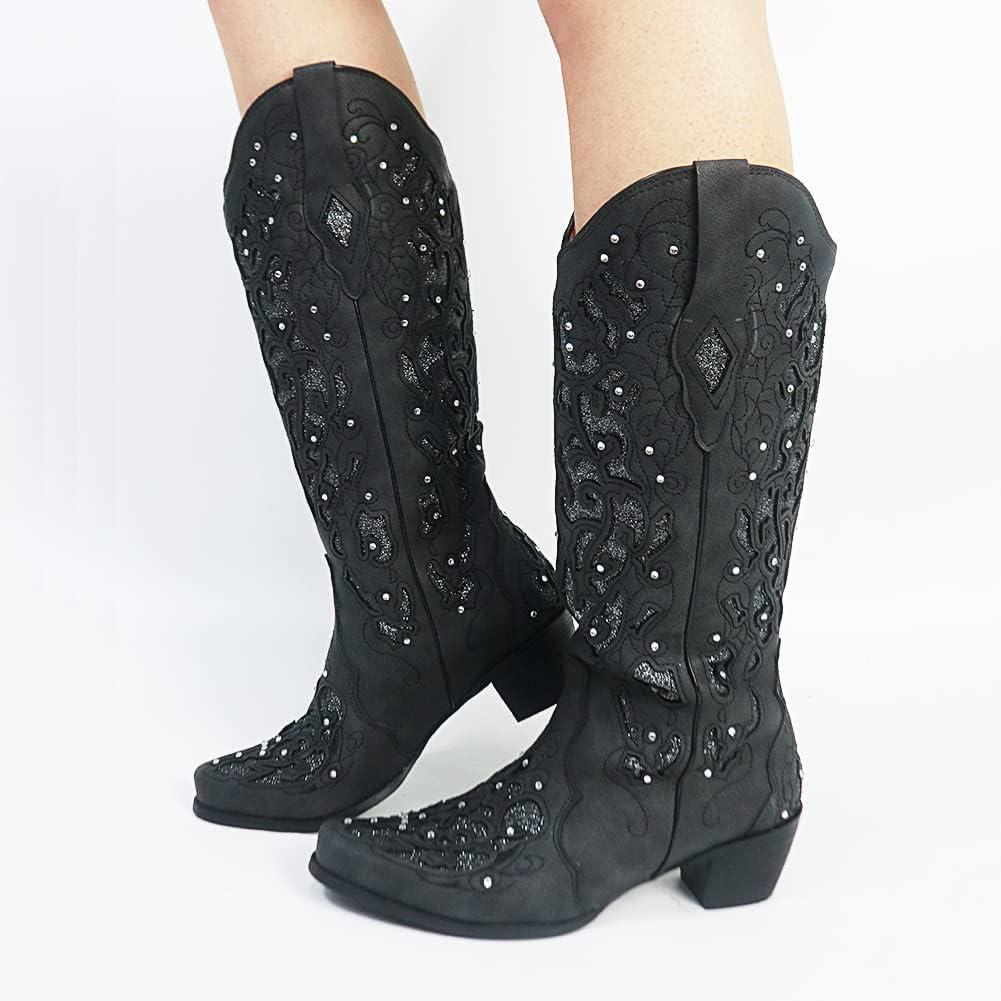 Tscoyuki Women’s Rhinestones Western Knee High Boots, Embroidery Pointed Toe Chunky Block Heel Cowboy Cowgirl Mid Calf Boots with Pull On Taps(Black)